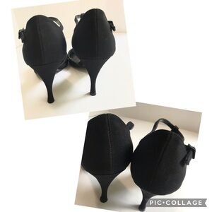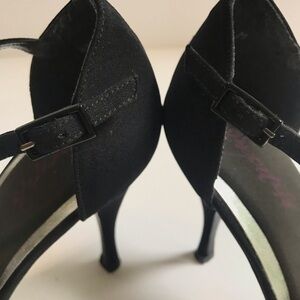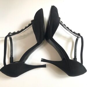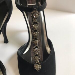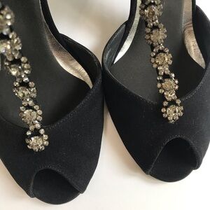 Stuart Weitzman Vintage Black Satin Peep Toe Heel with Crystal Embellishment T-Strap Shoe Evening Formal Elegant Retro Heels