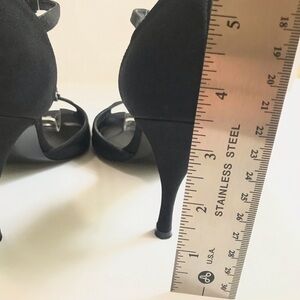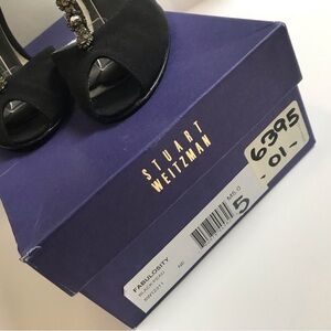 Stuart Weitzman Black Satin Peep Toe Heels Crystal Embellishment T-Strap Sz 5