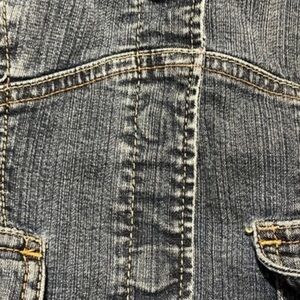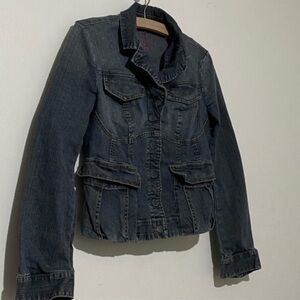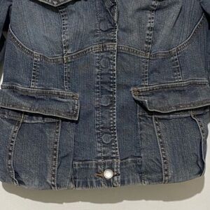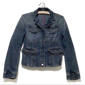 Express cropped denim jacket with pink accents and snap buttons
