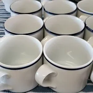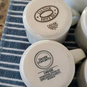 5 mugs are Dansk Bistro with 1 solid blue line around the rims and 8 mugs are Dansk Concerto with 2 blue stripes around the rim, all neatly stackable
