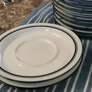 11 plates are Dansk Fredriksborg Blue (3 dots on rims + double lines), 2 plates are Dansk Bistro with only the 2 blue lines