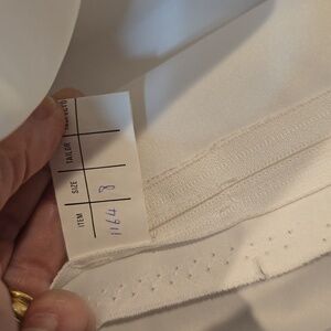 this is a beautiful dress by Mary's import Bridals, it is 100% polyester and the inner dress is 100% nylon. this dress has gorgeous Flowers made of pearls and sequins and little puffy sleeves that could be worn off the shoulder. it is very full and needs to be steamed to bring out that fullness. the dress says it's a size 8, I don't know how that would correspond to today's sizing since this is probably 30 years old but it is in exquisite condition.
