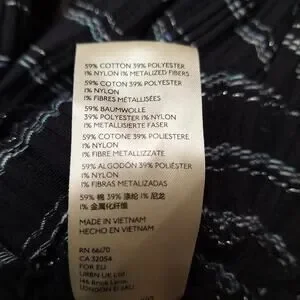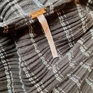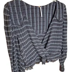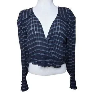 seer sucker style soft black fabric blouse with blue and silver metallic threads throughout deep v neck wrapstyle neckline with adorable puff sleeves with delicate buttons at the cuffs
