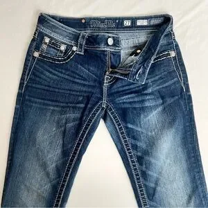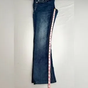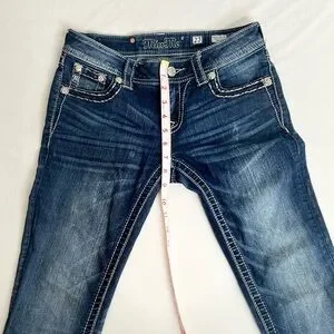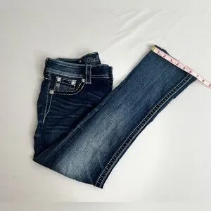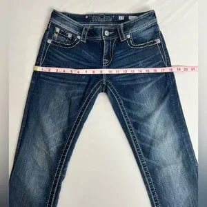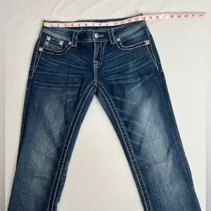 Miss Me Low Rise Dark Wash Rhinestone Faux Flap Pocket Jean Sze 27 (30X28.5) The jean has been shortened inside, the hem has been modified and two rivets are missing from the back.