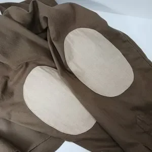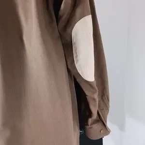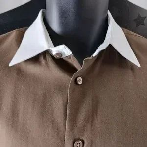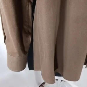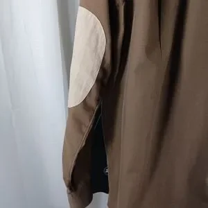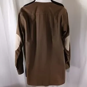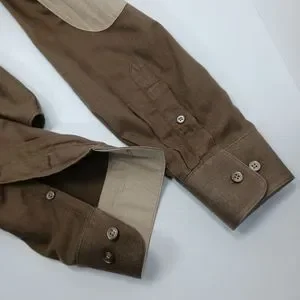Cotton with Cashmere makes a gentleman's flannel" shirt. Slight brushed appearance, soft good form and feel. Medium brown with stiff ivory collar and tan elbow patches. Freshly drycleaned, no flaws or wear. "Paul Fredrick offers a wide selection of men's casual shirts that combine sophistication, comfort, and versatility. Our casual shirts are made from relaxed fabrics for an exceptionally comfortable shirt that feels as good as it looks. Our casual shirts also come in fun and unique patterns-- At Paul Fredrick, we design our casual shirts for men who want to look polished and put together, without sacrificing comfort." Classic style by Paul Frederick!