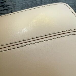 Block T smooth leather, zip around wallet in tan brown; Gold hardware. Small discoloration on front as shown. Not noticeable unless held up to light.