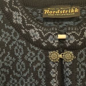 Beautiful vintage Norstrikk blue Nordic pattern on this stunning 100% virgin wool cardigan with pewter color buttons. The details!!! Made in Norway. EUC Ask questions before purchasing because ALL SALES ARE FINAL