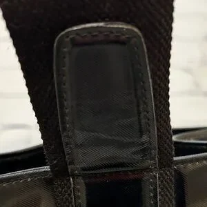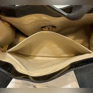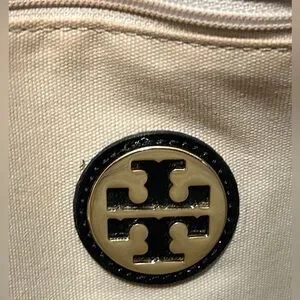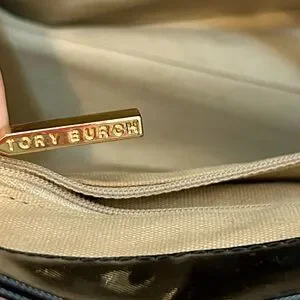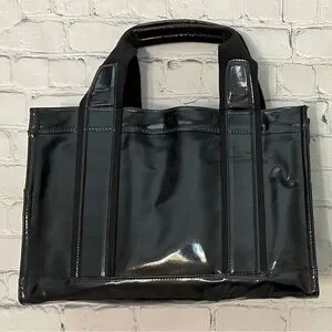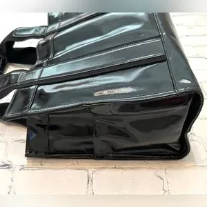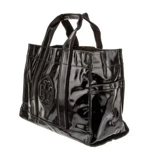 Beautiful, versatile bag. Great for work or going out. Black patent leather with large Tory logo on front, two small exterior side pockets and two large interior zipper pockets. Beautiful interior gold hardware. Fabric and patent blend handles - minor cracking in top handle pads (pictured) is really the only sign of use. Great bag!