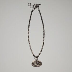 A Lois Hill granulated sterling silver pendant necklace with a byzantine link chain. This piece features oxidized sterling silver with granulated silver detailing. Excellent condition, has some minor surface wear on the back of the pendant. 18 inches in total length, 9 inches from pendant to chain link.