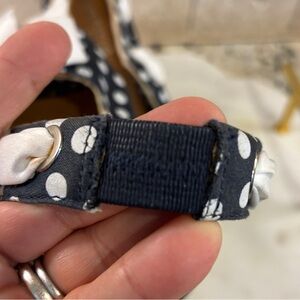 Cute and classy Sperry Wedge Slingbacks. Navy and white Polk dot with cork covering the wedge. There is a white ribbon laced through the slingback strap ending in a cute bow. Uppers made with textiles and leather. Cork is in great condition. Bottom of shoes have minimal wear. Gently pre-owned.