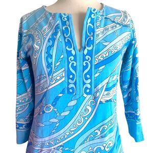 Gorgeous and breathable summer dress in a colorful swirl mix of pastel blue, white and aqua shades with paisley and chain or nautical rope print. Three quarter length sleeves with slits at the elbow and slit at the neckline. Very sporty and LP vibes! 95% cotton, 5% lycra.