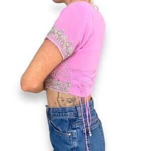 Gorgeous baby pink crop top with corset-style side ties. Beautiful silver white beading and gemstones throughout in a woven spiral pattern with embellished edges. Corset style hook closures, with side lacing on both sides. Neck tie on the backside with dangling beaded strings. Minor imperfections like stones missing, only visible under close scrutiny. Condition 9/10