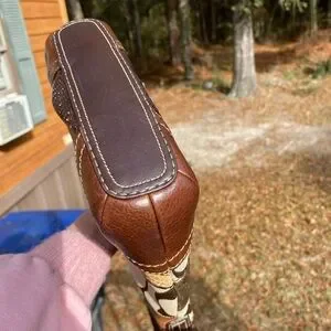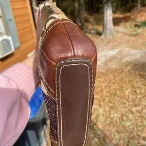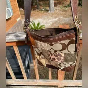 Patchwork Coach Bag with adjustable Straps. Brown Leather trim. Measures 10 X 10.