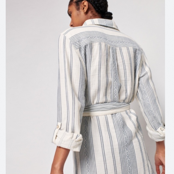 Crafted from a breezy organic-cotton double gauze, this shirt dress features a charming jacquard stripe and a matching waist-defining fabric belt.