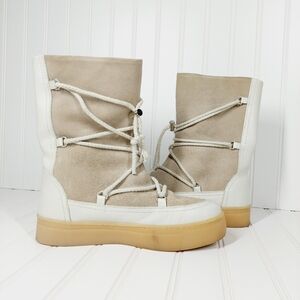 Flat taupe boots, contrasting materials, crossover laces over the instep, rubberized Block heel, lined