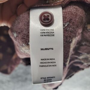 Size XXL, flat measurements in photo #3. Reddish brown color with orangy/gold paisley print. Made of viscose, no stains or flaws noted.
