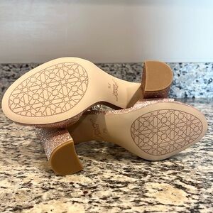 Jewel Badgley Mischka block heel sandals in rose glitter (a mix of champagne and pink glitter) with rhinestone embellished around-the-ankle strap - Rear zip closure - Beautiful formal occasion shoes - Brand New - No box - No tags - No flaws - All gems in tact - Rear heel height is 3.75” - Manmade upper, lining, and sole - Size 7-1/2M