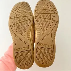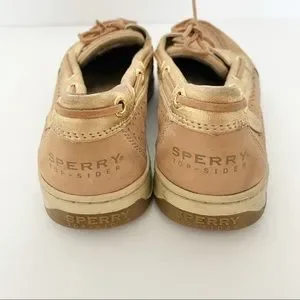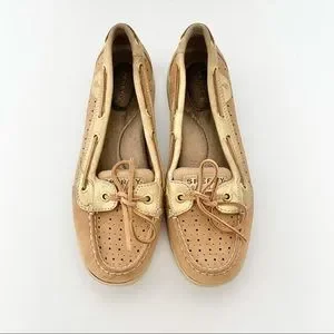Tan with Gold Metallic accent boat shoes from Sperry bSuper comfy and stylish. Minor signs of normal wear, in good condition. See pictures for details.