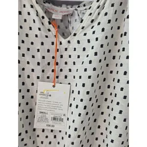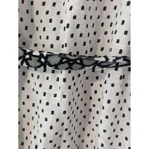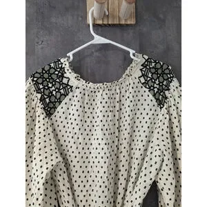 A beautiful boho dress with a smocked bodice and tiered skirt. The dress is a cream color with black and green geometric print. It has a V-neckline and 3/4 sleeves. The dress is belted at the waist with a matching fabric belt. It is lined with a soft, lightweight fabric. The dress is NWT. It is perfect for a spring or summer day.