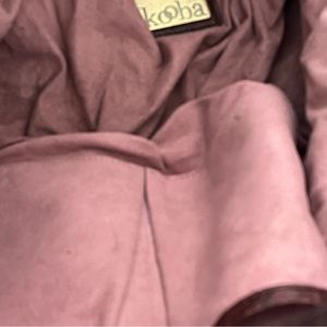 KOOBA Ana Style Burgundy Pebbled Glazed Leather Satchel with Burnished Brass Hardware. One Interior zipper pocket, two interior pouch pockets. Exterior two pouch pockets in front with magnet latched. Exterior burgundy leather with good buckles. Interior rose pink velvet like fabric lining. Strap drop 9”. Small spots on lining.