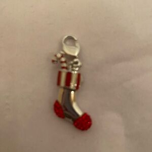 Elegant Swarovski charm. Features a festive stocking design. Perfect for holiday jewelry.