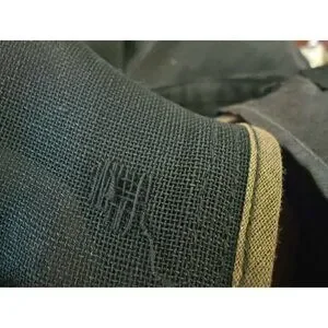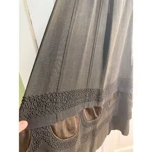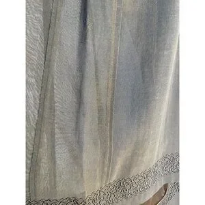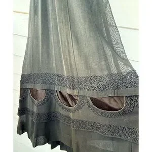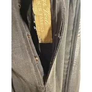 This exquisite antique 1910's French voile skirt features stunning soutache and velvet embellishments. Its rare XS size and elegant black color make it a unique addition to any vintage collection. This skirt has a label that says 274 Voile Lupin's Fabrics Made in France. The waist is 23" and the length is 36". The waist has some boning at the top and hook and loop closure up the back. It has a slight pleated in the back. The fabric is very sheer and see through. It is in very good antique condition with some minor flaws. There is a small hole that has a repair at one time. The fabric seems to have slight fading of the black where at may have been folded for storage. Overall in very good antique condition.