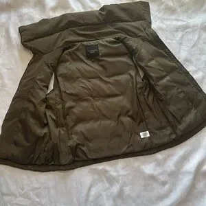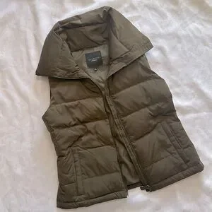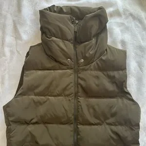 Dark olive green puffer vest with down fill and high collar. Fleece lined side pockets. Excellent condition, no stains, like new! Armpit to armpit approx 21”, length from shoulder to hem approx 24”. Waist approx 21.5” across at hem. Zippered collar can be buttoned down, see last pic.