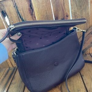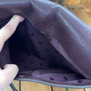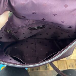 Great eggplant color, zipper top, back pocket w/ magnetic snap, 2 inner pockets and smoking hot eggplant fabric spade interior. LIKE NEW