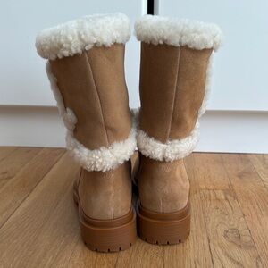Step into comfort and style with these tan shearling boots. Perfect for keeping warm and fashionable. Worn once. Like new