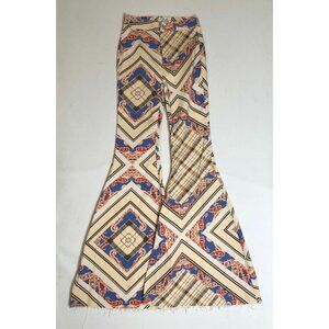 In a clean silhouette and geo print, the flat front, high-rise jeans feature a flared leg with a raw hem. Back seam detailing on the knee super soft and super stretch fabric back pockets button closure and zip fly