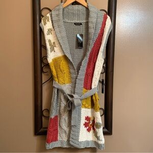 *NWT* Vertigo Long Cardigan Sweater. Grays, Maroon, Wheat Yellow, Green and Cream. Gorgeous chunky textured loose knit, open front, waist tie, sleeveless, super soft 100% acrylic, machine wash. New with tag, no flaws, see pictures for details.