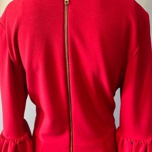 BETSY ADAMS RED DRESS WITH BELL PUFF SLEEVES, FULLY LINED, BACK EXPOSED ZIP ON TOP AND BOTTOM OF DRESS