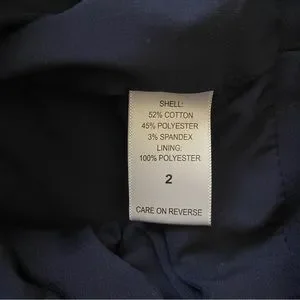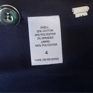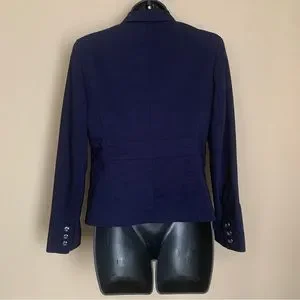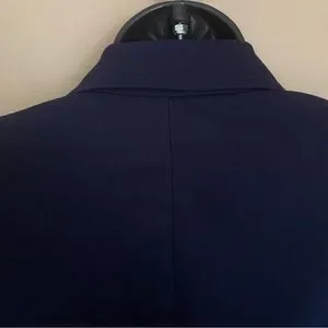 Two metallic silver shiny button closure. Shoulder pads. Stretch. Structured. Two faux flap pockets.