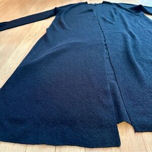 A classic long black cardigan a wardrobe staple! Flowy material and slits on the side create a nice silhouette. Gently used condition; a few pulls but nothing significant.