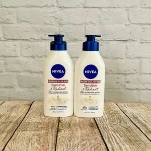 Brand new Nivea Sensitive & Radiant Body Lotion. These are the LARGER size of 20 fluid ounces each (most sold are 16.9 ounces). Both bottles are identical.