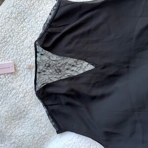 Elegant black blouse with lace cap sleeves. V-neck design. Perfect for casual or formal wear. Petite small