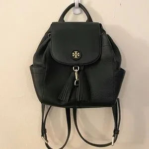 Tory Burch black pebbled leather backpack. Gold hardware clasp with leather tassels. Interior and exterior pockets. Excellent condition -- only worn out twice!!!