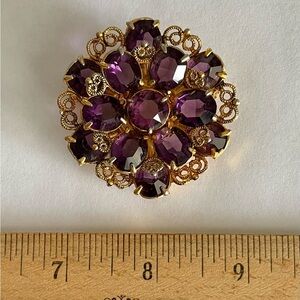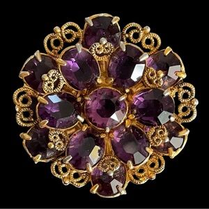 Stunning!! Vintage dark amethyst crystal stones and goldtone filigree medallion brooch. About 2” In mint condition.