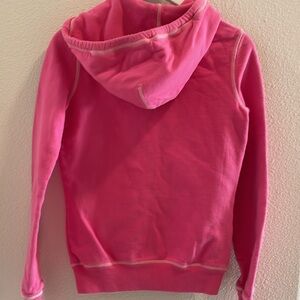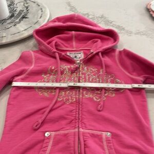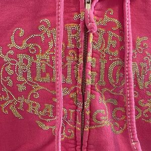 Absolutely stunning! Women’s pink true religion zip up hoodie. Women’s size extra small but please see images for exact measurements. pink with gold lettering and rhinestones. Great condition, small dark mark on right sleeve, (see pic) but should come out with spray and wash. Smoke free, pet free home.