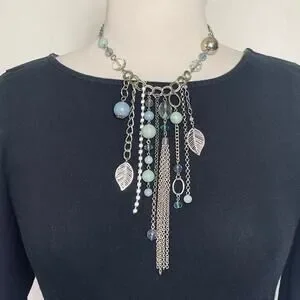 Women’s Boho Multi Media Silver Tone Necklace With blue beaded detail, leaves, chains and rhinestones.