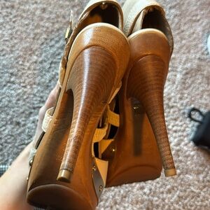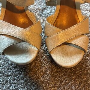 Cream color, Aldo heels. 5 1/2 inches. The platform on the shoe is about an inch as well. In excellent condition.