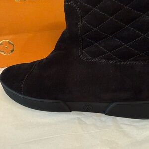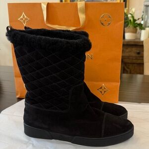 Authentic Louis Vuitton black quilted, suede, shearling winter boots. Women’s EURO size 40. Great condition. The inside is like new. Only worn a few times. I bought these comfortable boots from the Louis Vuitton store inside Neiman Marcus. Rubber sole. Made in Italy. 10” tall. MAO166. Includes shopping bag.