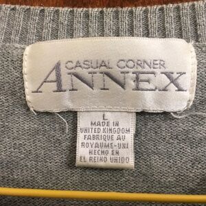 Unique grey cardigan. There is ribbing on the sleeves and under arm side panels. Interesting look. No tags, but never worn. All buttons intact. Can be hand washed. Bottom width is 17” and 22” length from neck back.