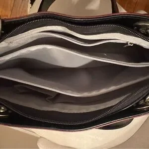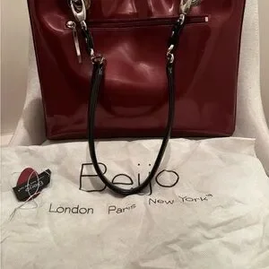 Beijo burgundy patent leather bag. Features 2 sizes of detachable black straps. Dust bag and original tags. Only used once or twice. Perfect for any occasion. Excellent condition with Small crease in leather - see photo