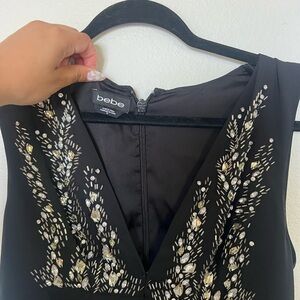 Turn heads with this stunning VINTAGE BEBE black sleeveless dress, featuring intricate silver embellishments that add a touch of glamour. Perfect for special occasions, evening events, or a night out.