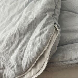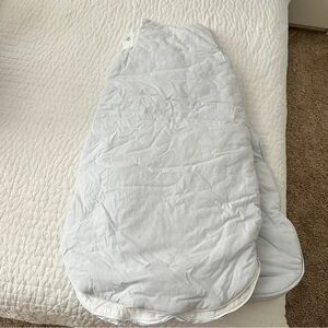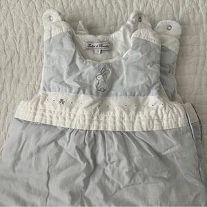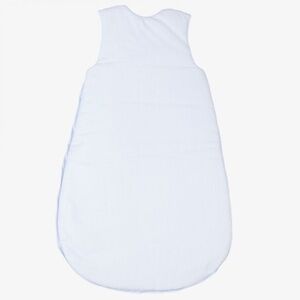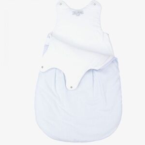 Lovely blue sleep bag for baby boys by Tartine et Chocolat, made in soft cotton. The poplin outer is blue with a fine dotted design and has a white bib panel with a cute embroidered grey bunny. Lightly padded and lined with soft jersey, it fastens with poppers on the shoulders and a zip on the side and along the bottom.