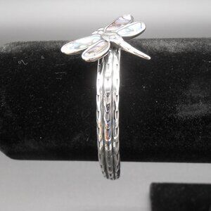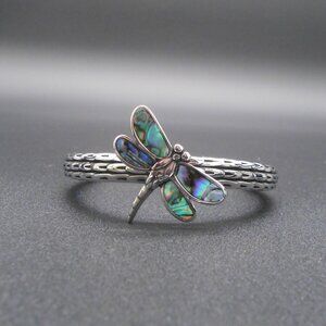 Add to your collection with this stunningly designed cuff bracelet laced with abalone shell. The designer accessory features an exquisitely carved forefront crowned with a dragonfly motif. The shell beautifully adds colors to this artisanal masterpiece, as the light plays across it. The dragonfly symbolizes wisdom and transformation.