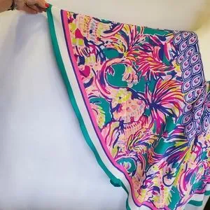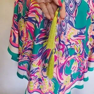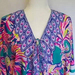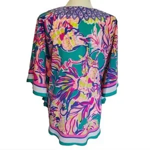RARE Lilly Pulitzer's Hard To Find and absolutely stunning Lettie 100% silk caftan blouse in the colorfully vibrant Agate Green Safari Sighted. This top has it all... it's lightweight, breathable, flowy, oversized, silky and it's feminine, flirty and fun to boot!! Not to mention... its gorgeous!! From its plunging lace-up neckline that flaunts its tasseled ends to its flowy elbow sleeves that lets the breeze flow through, you will love everything about this Lilly!!
