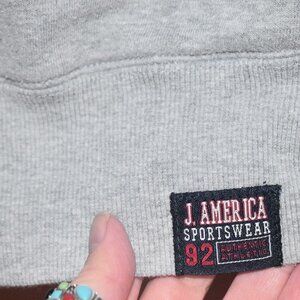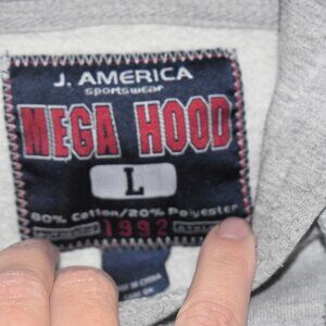 Classic Lambeau Field Sweatshirt, Home of the Frozen Tundra in Green Bay. Home of the Green Bay Packers football team. This is a hooded, pull on sweatshirt with drawstring and hand warmer pocket. The sides are ribbed inserts. The front Says LF Lambeau 1957 with a football player. Down the sleeve is printed - LB Frozen Tundra. The inner label says J America Mega Hood L.
