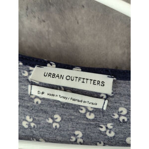 This is a pre-owned navy blue floral print dress by Urban Outfitters. It features a V-neckline, 3/4 sleeves, and a flowy A-line silhouette. The dress is made of a soft, lightweight fabric and has a relaxed fit. The dress is in good condition with no visible signs of wear or damage. The size tag indicates a size S-P. The dress is made in Turkey. The dress has a black care tag with instructions for machine washing cold, tumble dry low, and iron as needed.